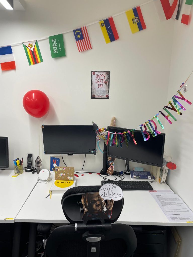 On Saturday it’s one of our colleges birthday so me and Dagyum (another DPS student) were tasked with decorating her desk. She likes horror movies so we did that as our theme.